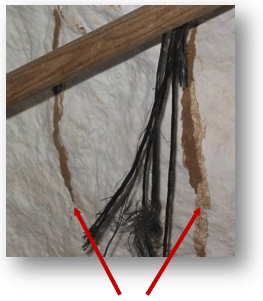 La aparición de cordones de apariencia terrosa pegados a la pared o techos denota la presencia de termitas. Estas construcciones de las termitas aparecen en ocasiones en forma de "estalactitas" o "estalagmitas".
