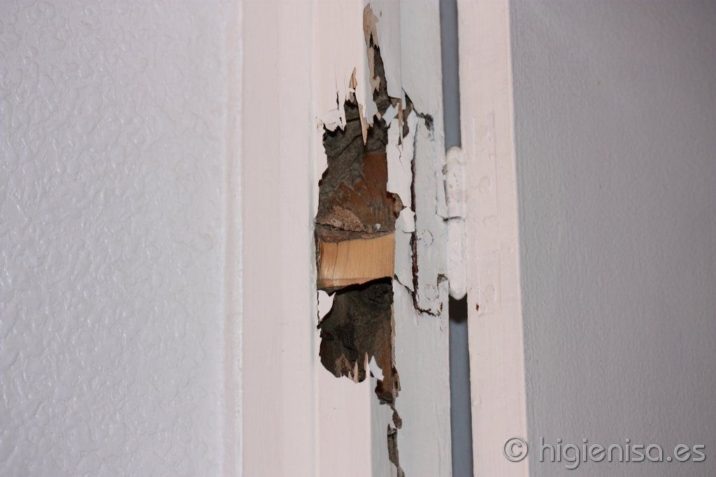Otra manifestación de la presencia de termitas es la aparición de pequeños orificios negruzcos en paredes de yeso. Se producen cuando la termita ha atravesado involuntariamente la pared y ha sido tapada inmediatamente.