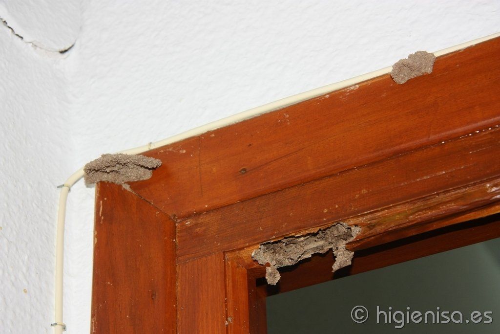 en marcos de puertas y ventanas, vigas, etc. Signos y rastros evidentes de presencia de termitas como tubos de barro, canales de progresión, arenilla, etc.